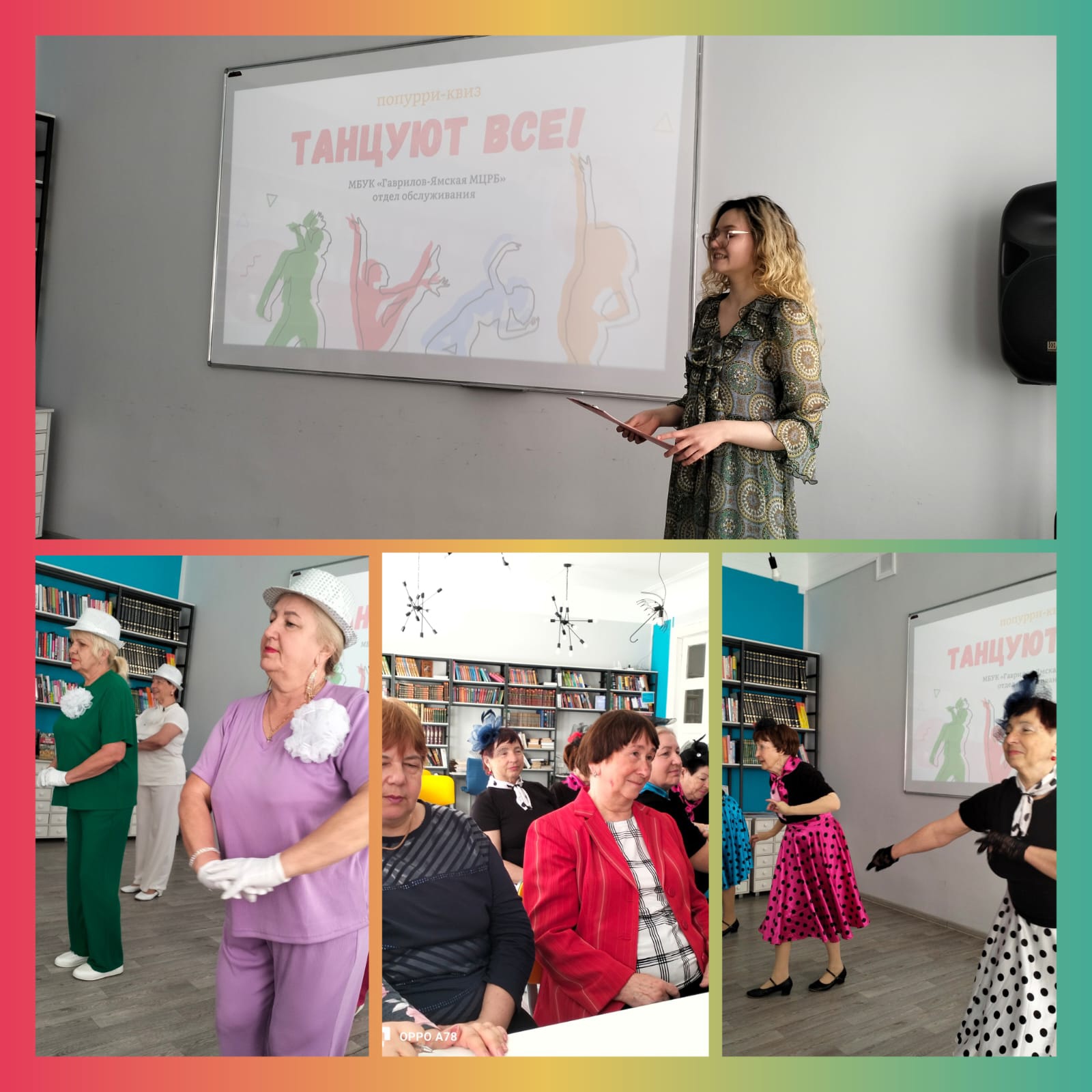 Активисты из Гаврилов-Яма вместе с посетителями модульной библиотеки 27 апреля отметили Международный день танца. Для участников встречи был организован квиз «Танцуют все». Открыли мероприятие люди пожилые, но творческие. Костюмы, улыбки на лицах, а как без них? А далее игра по станциям: пришлось подумать, поразмышлять, вспомнить. Ответить на интересные вопросы, касающиеся танцоров, танцев из фильмов, угадать по мелодии название песен. Закрыл встречу танцевальный коллектив «Искусство не стареть».