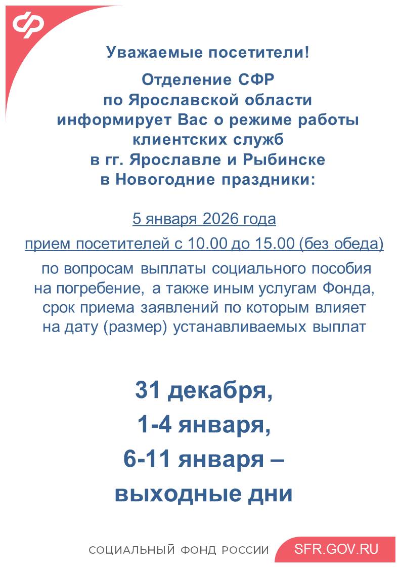 О работе клиентских служб СФР в Ярославле и Рыбинске в новогодние праздники